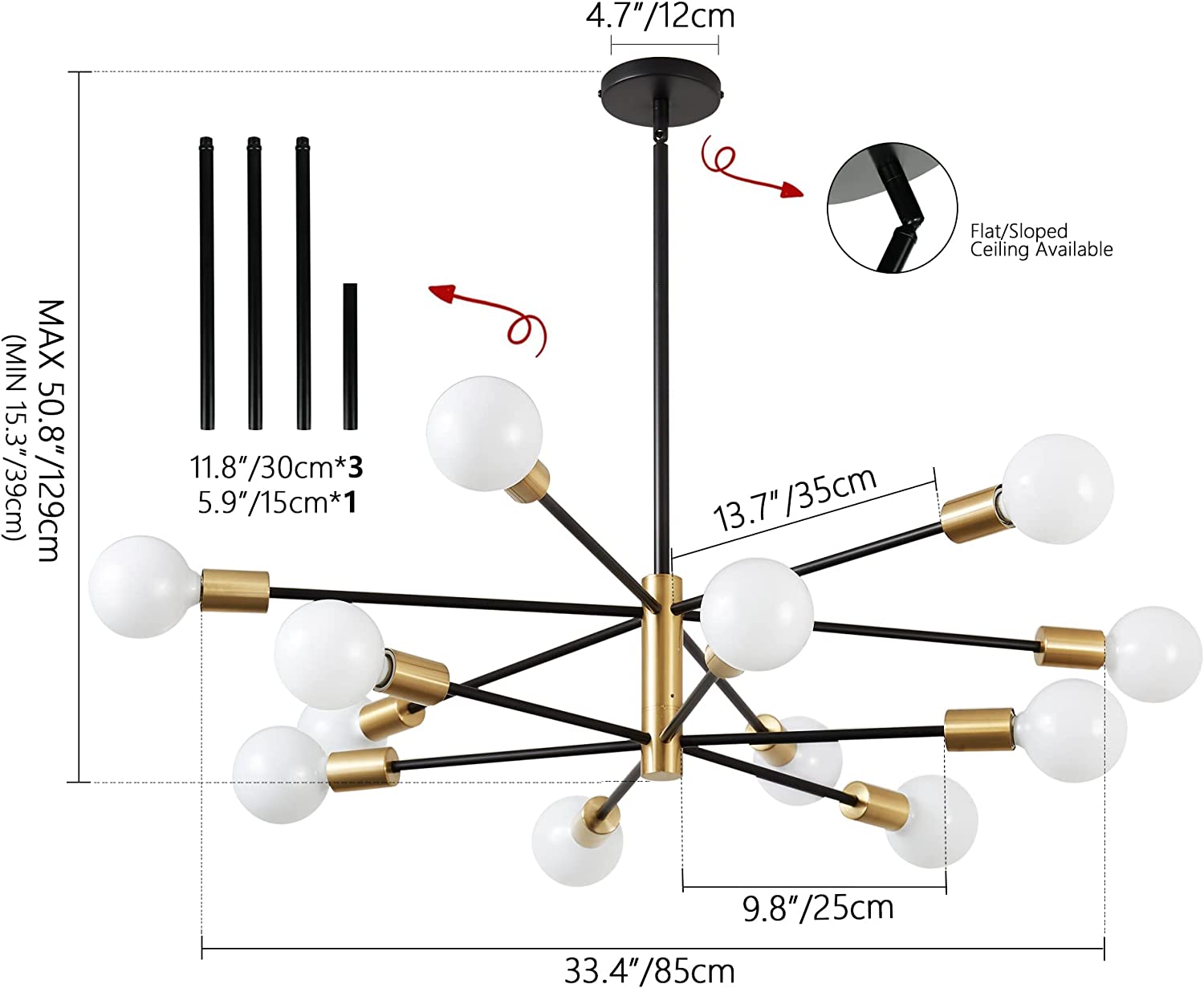 Bulb Requirements - Uses 12 medium-base (E26) light bulbs, max 40W LED recommended (bulbs NOT included). The black and gold chandelier supports to use dimmable bulbs and compatible dimmer switch to create the perfect atmosphere (dimmer switch not included).